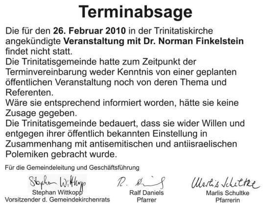 Norman Finkelstein ausgeladen hat. Im Übrigen, hat Herr Finkelstein auf